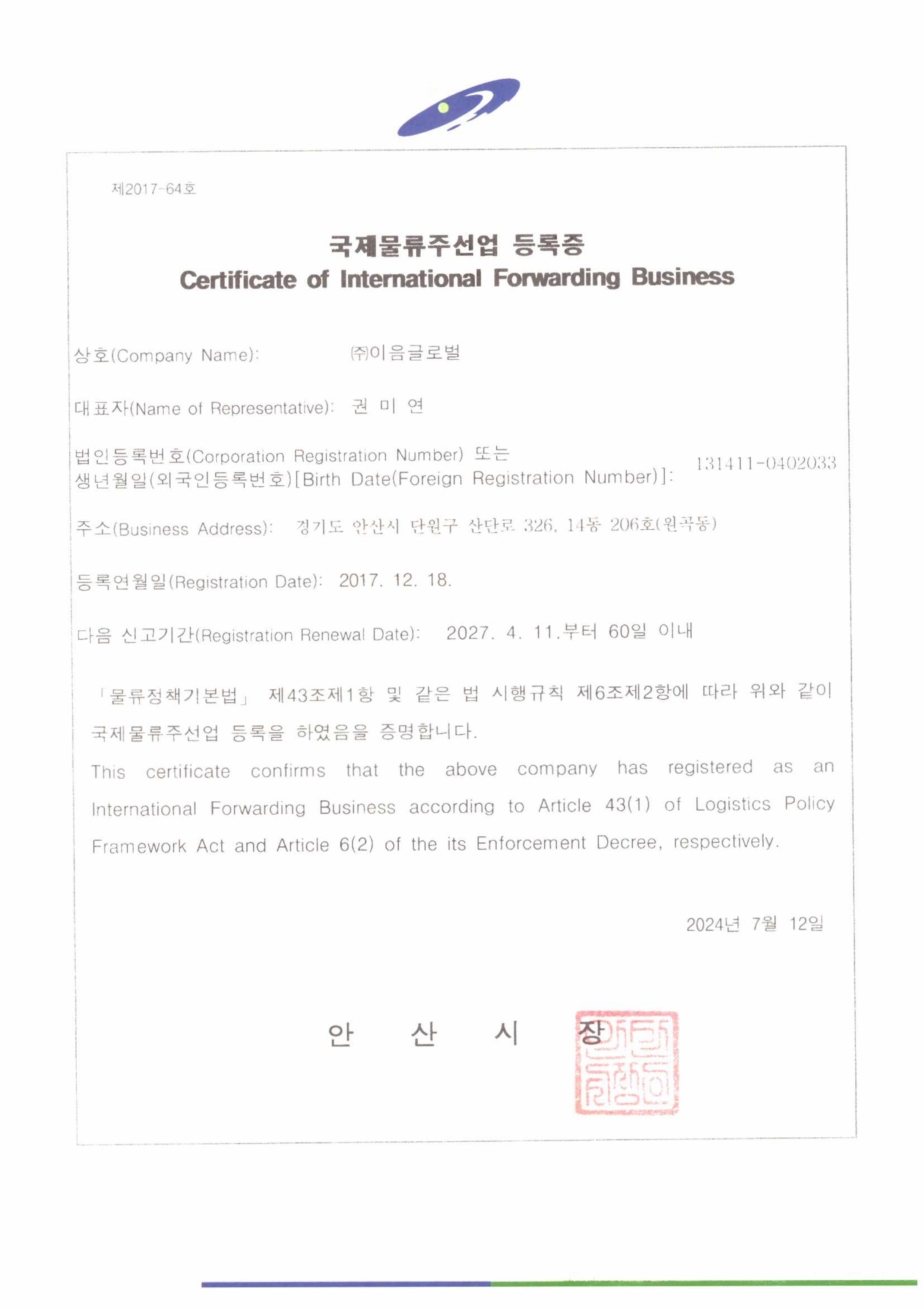 - (국제물류주선업등록)